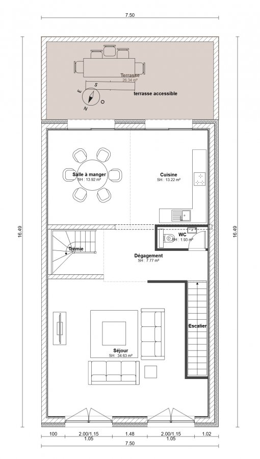 - Au rez-de-chaussée : un dégagement (+/-7.77m2), un WC séparé, un séjour (+/-34.63m2), une salle à manger ouvert (+/-13.92m2) sur une cuisine (+/-13.22m2) avec une accès sur une terrasse (+/-26.34m2) et un jardin (+/-600m2)