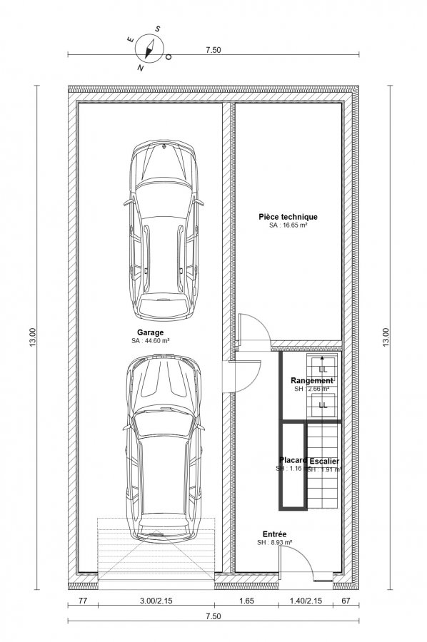 - Au sous-sol : une entrée (+/-8.93m2), rangement (+/-2.66m2) un garage 2 voitures (+/-44.60m2), et une chaufferie/buanderie (+/-16.65m2),