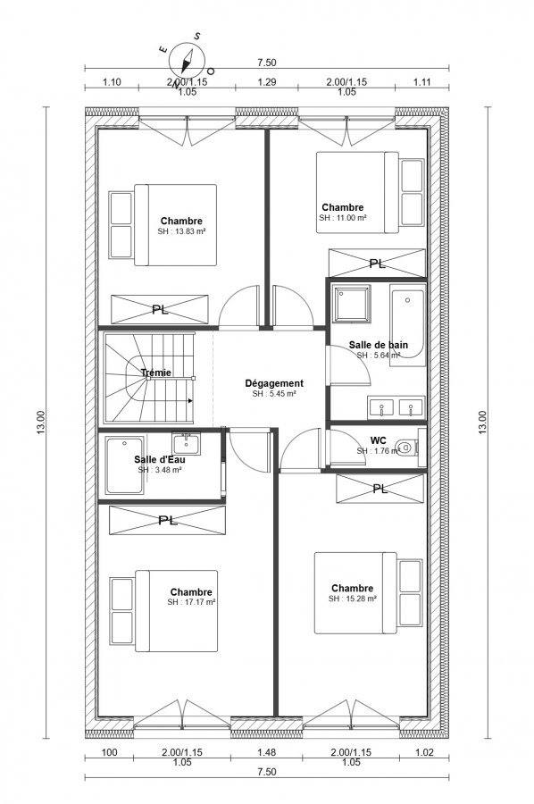 - Au 1er étage : une salle de bain (équipée : une douche, une baignoire, et une double vasque), 4 chambres à coucher (respectivement de : +/-11.00m2, +/-13.83m2, +/-15.28m2 et 17.17m2) dont une suite parentale avec salle de douche, et un wc séparé ;