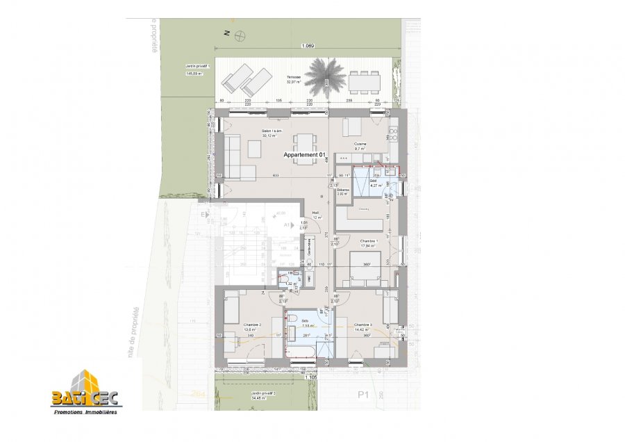 - Au rdch un appartement 3 chambres à coucher à 130.98 m2 vendable