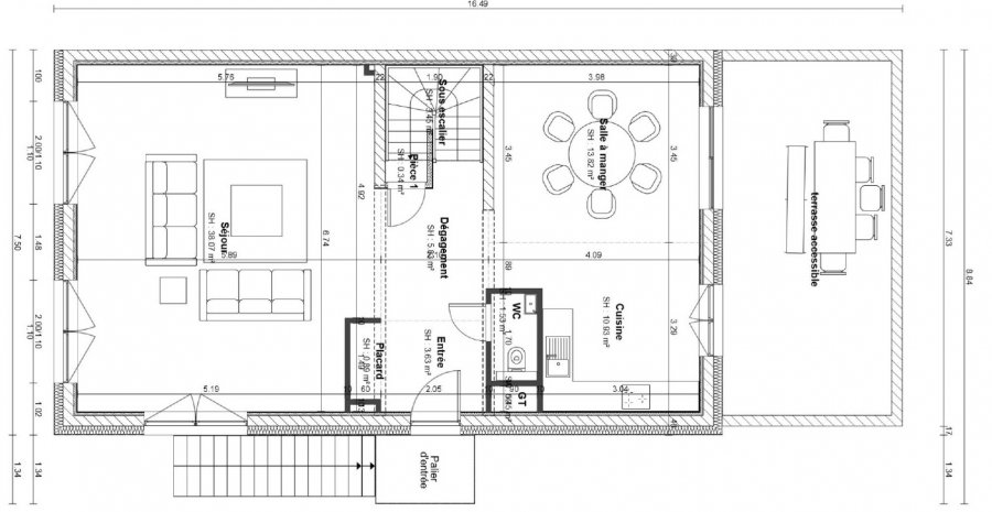 - Au rez-de-chaussée : une entrée (+-/3.63m2), un dégagement (+/-5.41m2), un WC séparé, un séjour (+/-38.18m2), une salle à manger ouvert (+/-13.84m2) sur une cuisine (+/-11.26m2) avec une accès sur une terrasse (+/-25.00m2) et un jardin (+/-600m2)